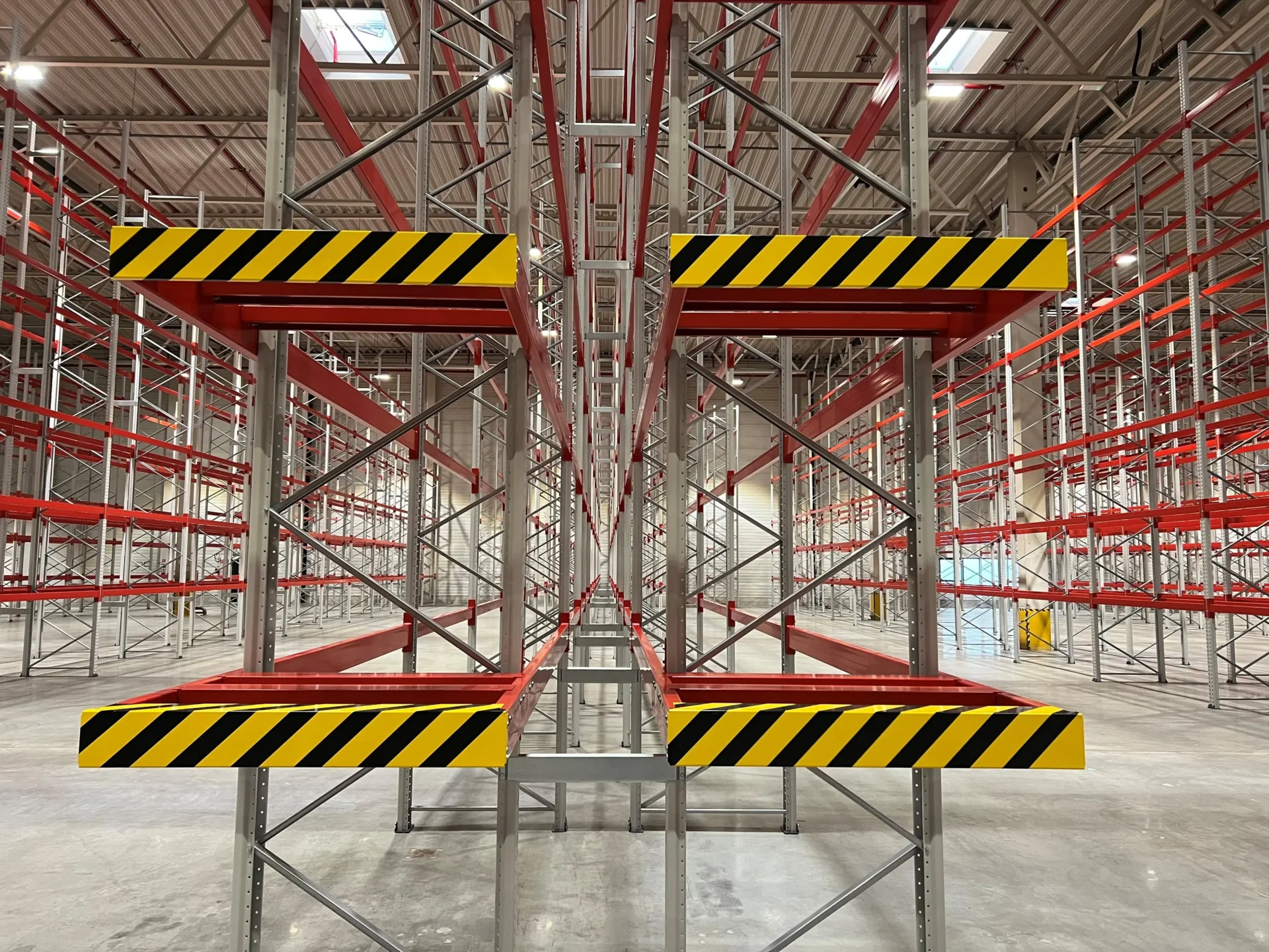 - Zabezpieczenia boczne i tylne – zapobiegają przypadkowemu zsunięciu się palet i towarów z regału.